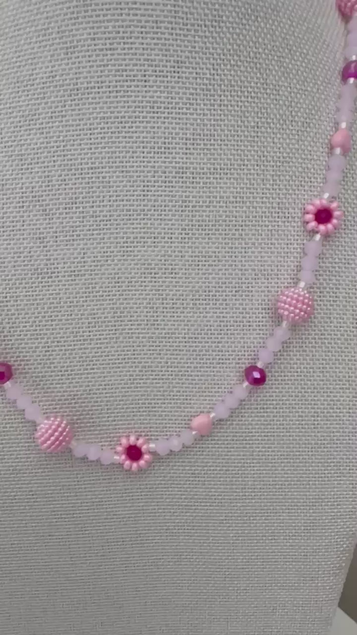 * Handcrafted with glass beads in pink and fuchsia tones, faux pearls, delicate seed beads, and handwoven floral bead details.