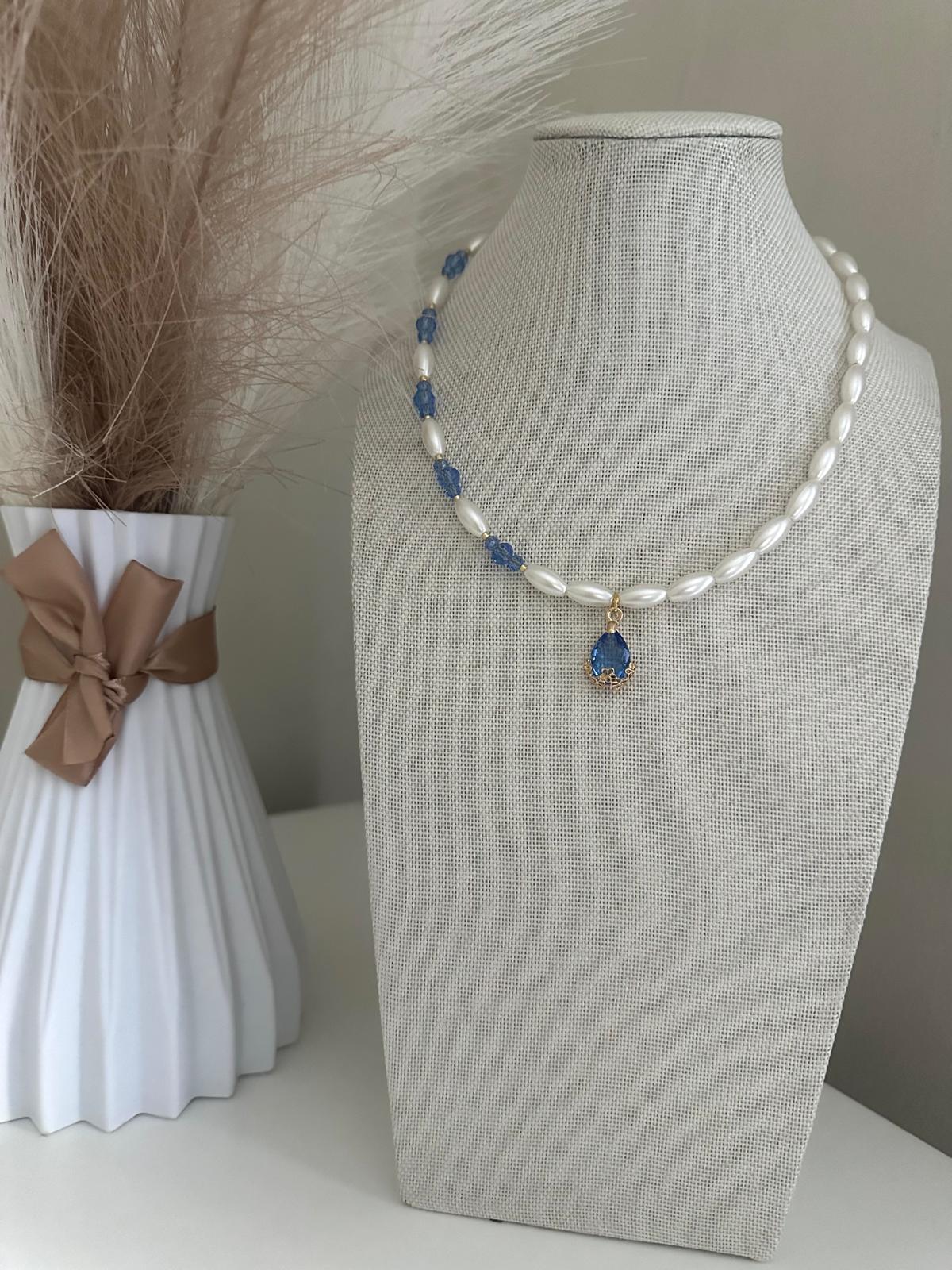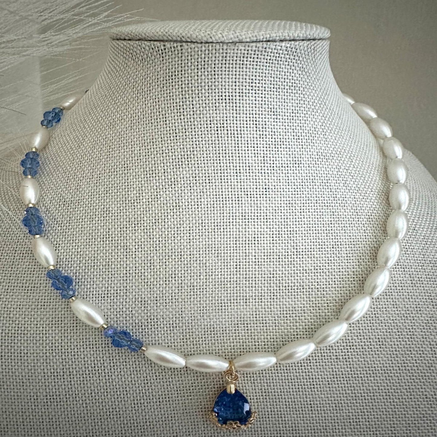 * Lovingly made with high-quality ivory white faux pearls (12 mm), high-quality blue crystal glass beads (4 mm and 6 mm), Miyuki golden beads (2 mm), and a golden teardrop design featuring blue rhinestone.