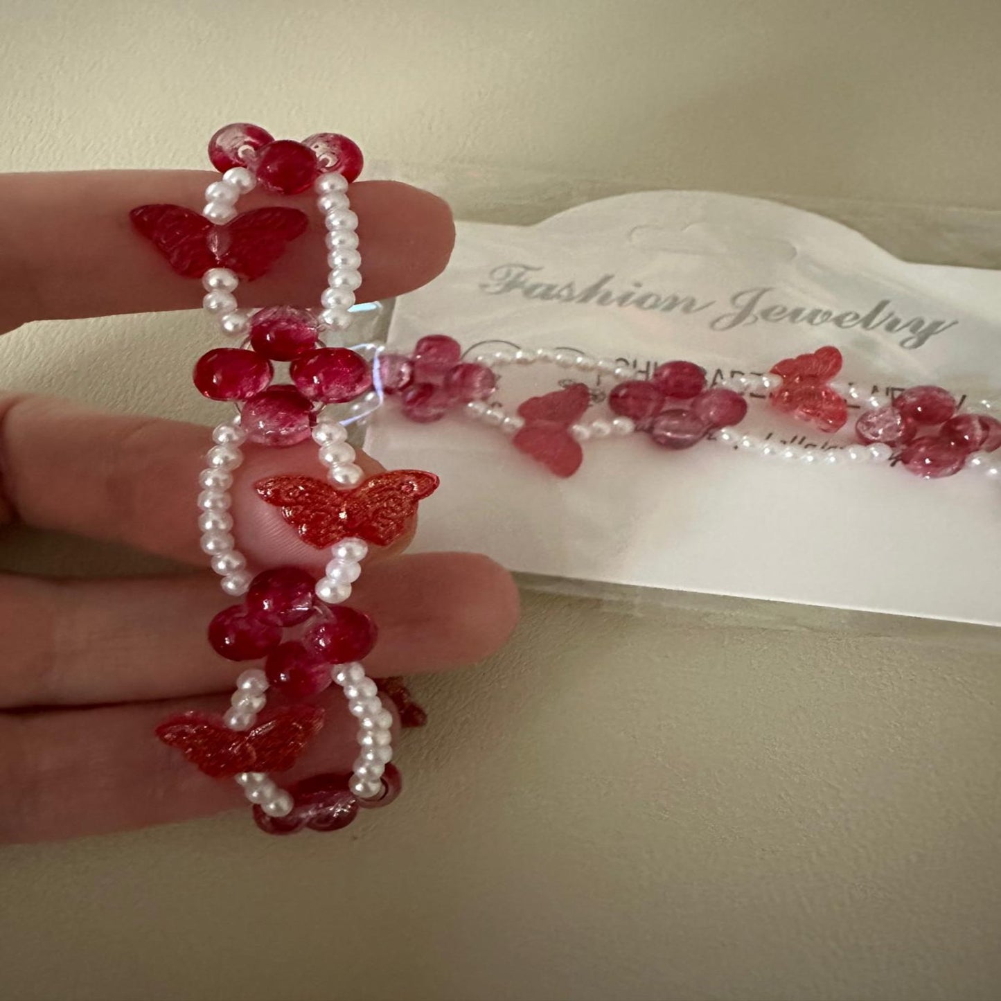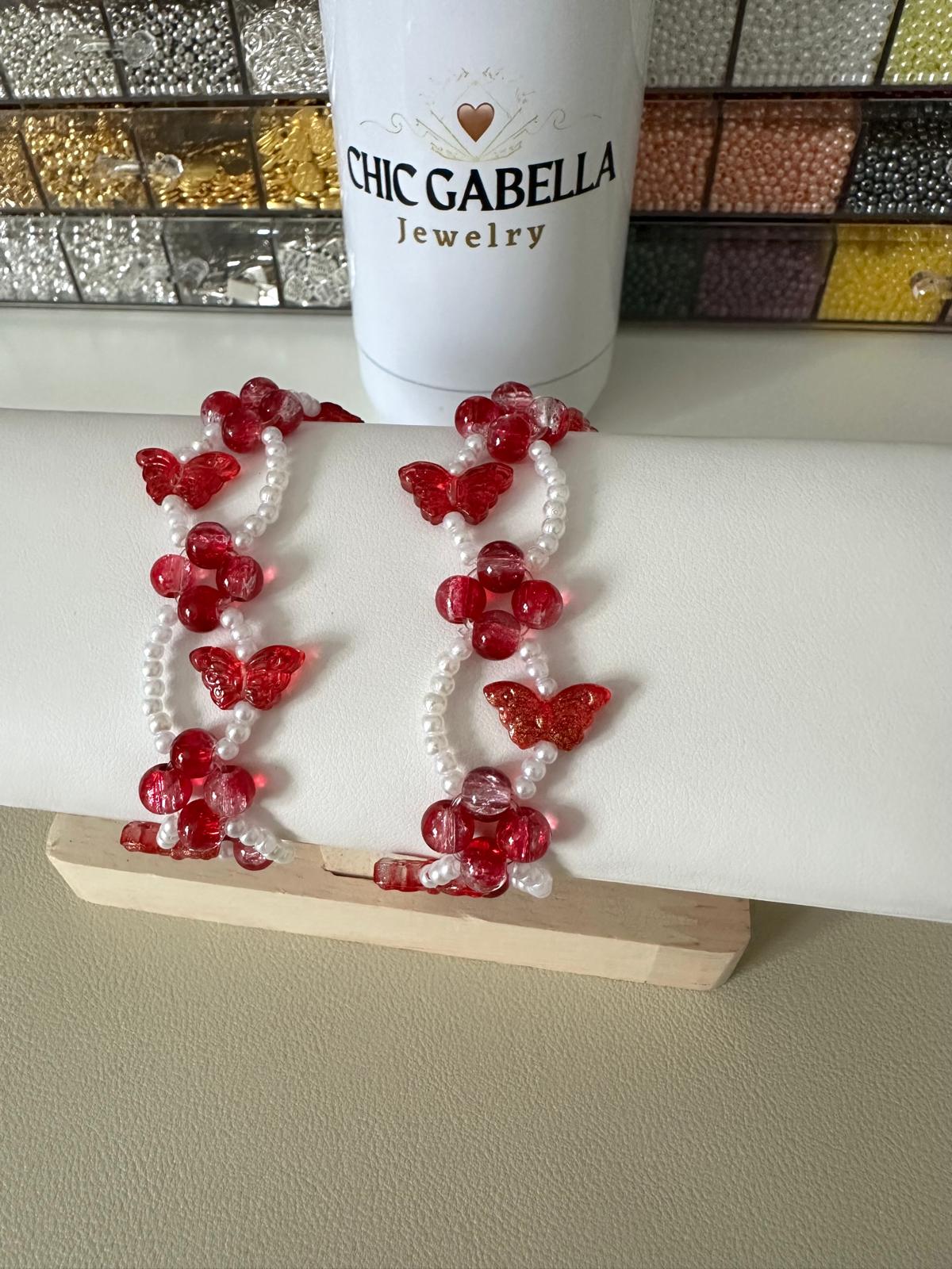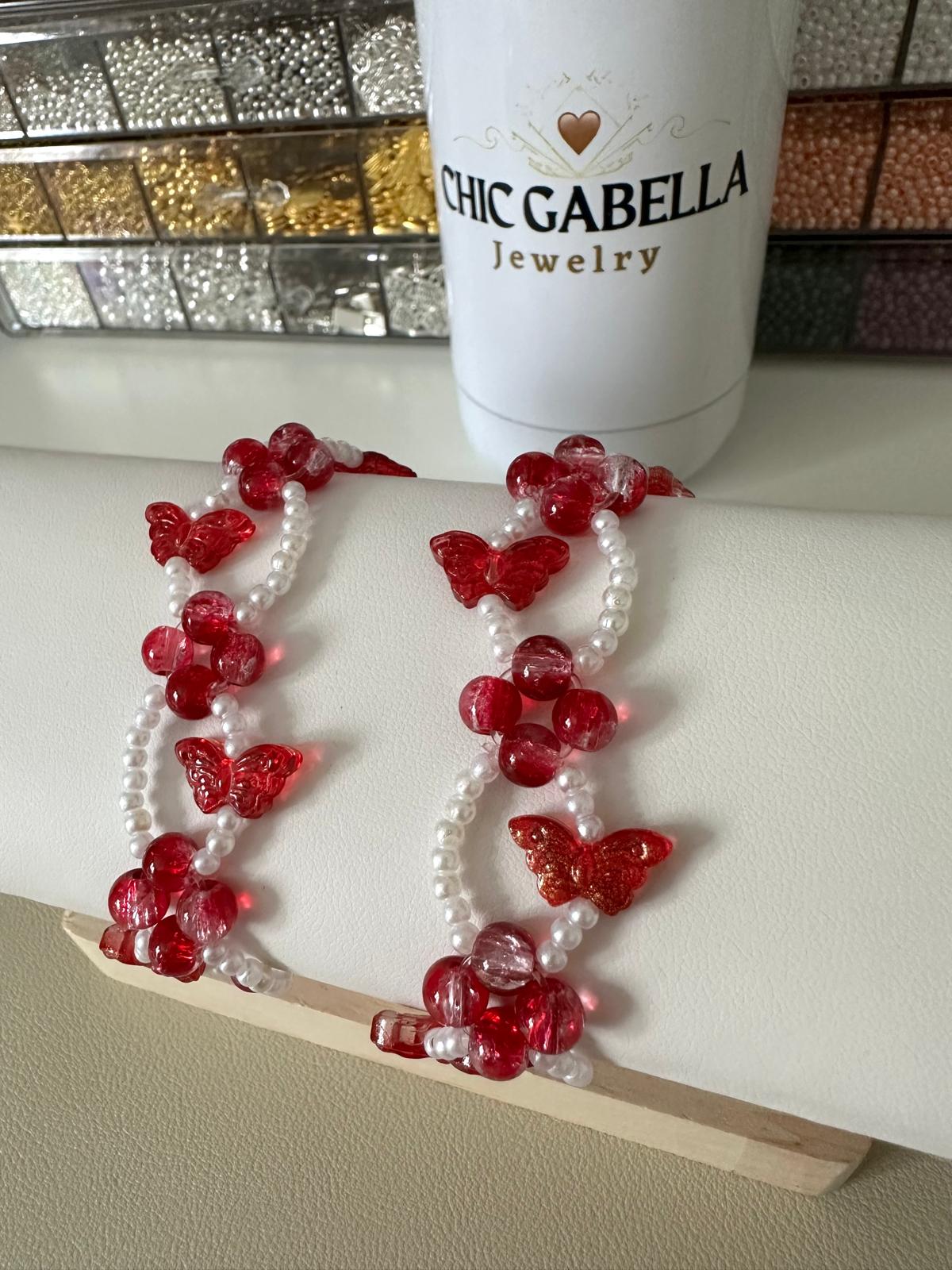 * Lovingly made with high-quality white faux pearls (3 mm), high-quality red glass beads (6 mm), a red butterfly-shaped beads (6 mm), and stretchy elastic.