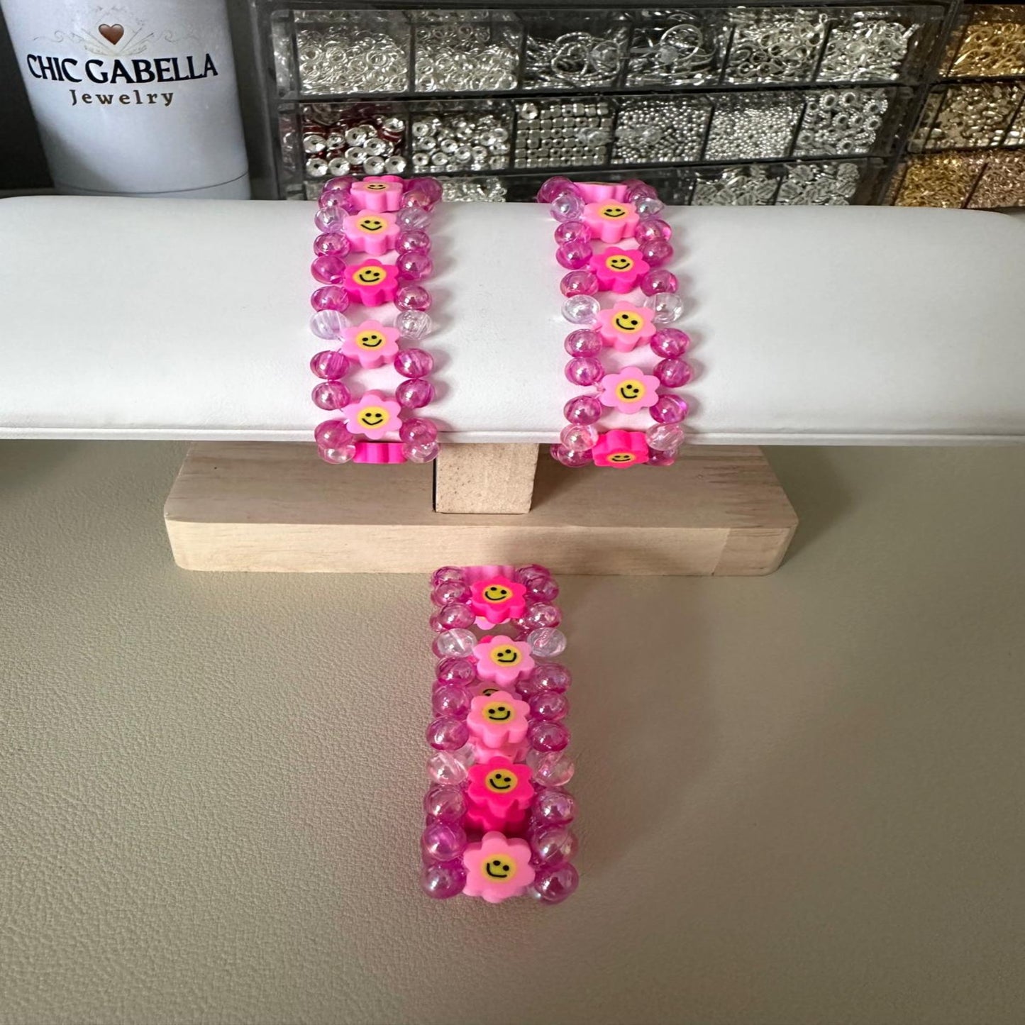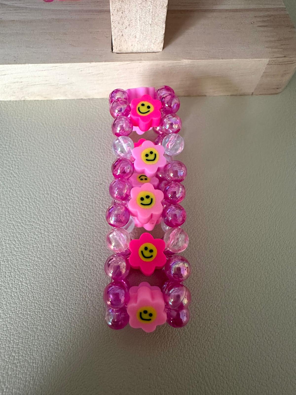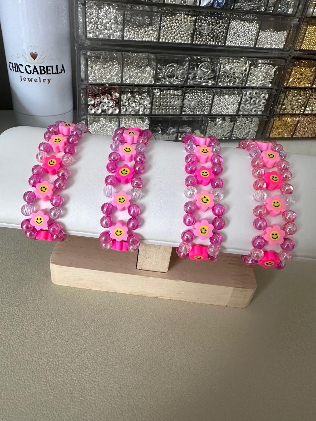 * Lovingly made with shades of pink beads (6 mm), smiley face polymer clay beads (9-10 mm), and stretchy elastic